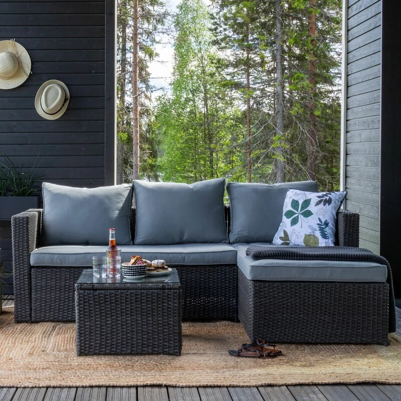 Tyylikäs ja helppohoitoinen Oakland divaanisohva, sohvapöytä ja pehmusteet. Sohvapöytää voidaan käyttää myös rahina, johon tulee myös pehmuste mukana. Pehmusteiden päälliset ovat irroitettavissa ja hellävaraisesti käsinpestävissä. Pehmusteet ovat tyylikkäät, vaaleanharmaat. Sohvapöydän/rahin mitat: 51×51 cm. Korkeus ilman lasia/pehmustetta 36 cm. Sohvan kätissyys ei ole vaihdettavissa. Sohva on oikean kätinen.