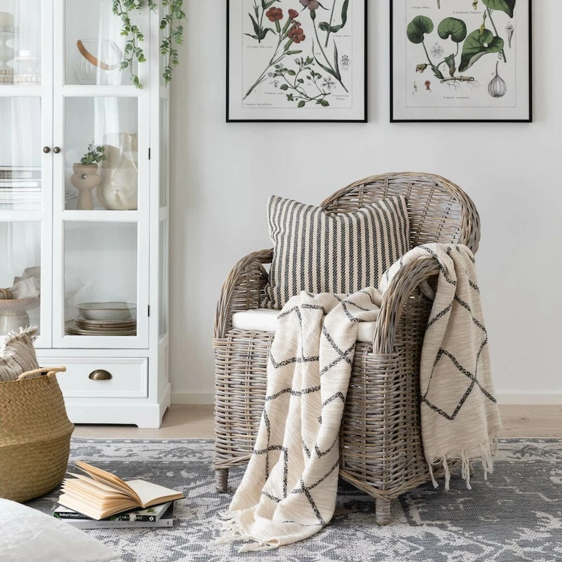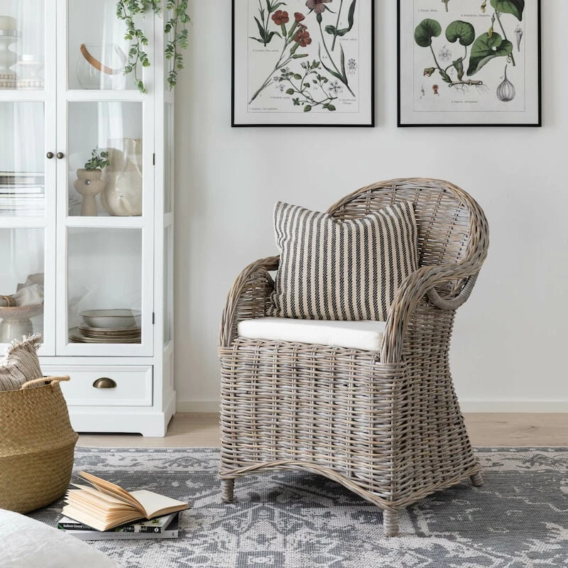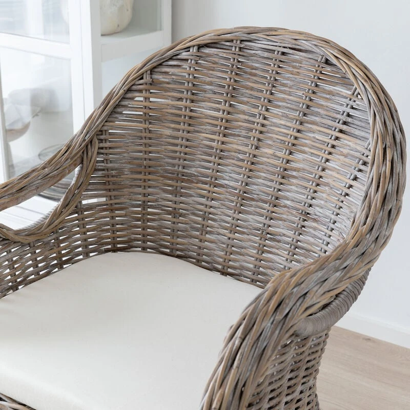 Kaunis rottinkinojatuoli sopii sisäkäyttöön, sekä katettuun ulkotilaan. Rottinkiojatuoli on valmistettu aidosta rottingista. Rottinki on ekologinen luonnonmateriaali ja sen ominaisuuksiin kuuluu värivaihtelut ja tummemmat kohdat. Värivaihtelut, epätasaisuudet ja käsityön jälki tekevät jokaisesta rottinkituotteesta yksilöllisen. Rottinki patinoituu ajan saatossa. Istuinosassa on luonnonvalkoinen istuinpehmuste. Kevyen painon vuoksi tuolia on myös helppo liikutella.