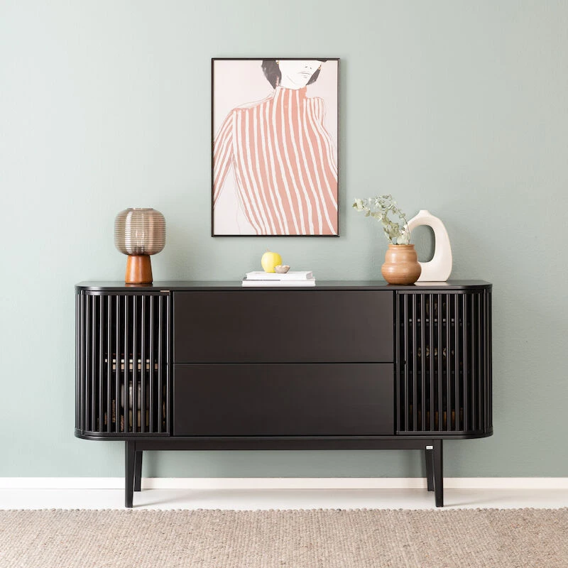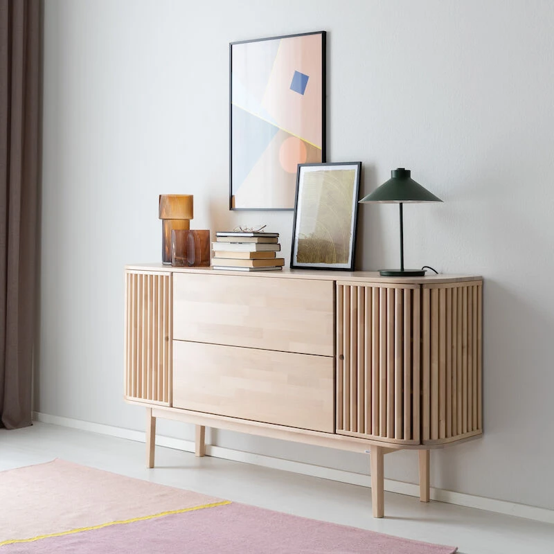 Senkin sisällä on runsaasti säilytystilaa. Molemissa päädyissä on kauniiden rimaovien takana kaksi hyllyätasoa sekä keskellä senkkiä kaksi reilun kokoista vetolaatikkoa. Valmistettu Suomessa Kiteen huonekalutehtaalla.