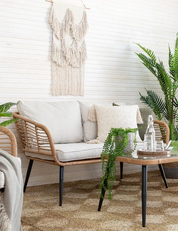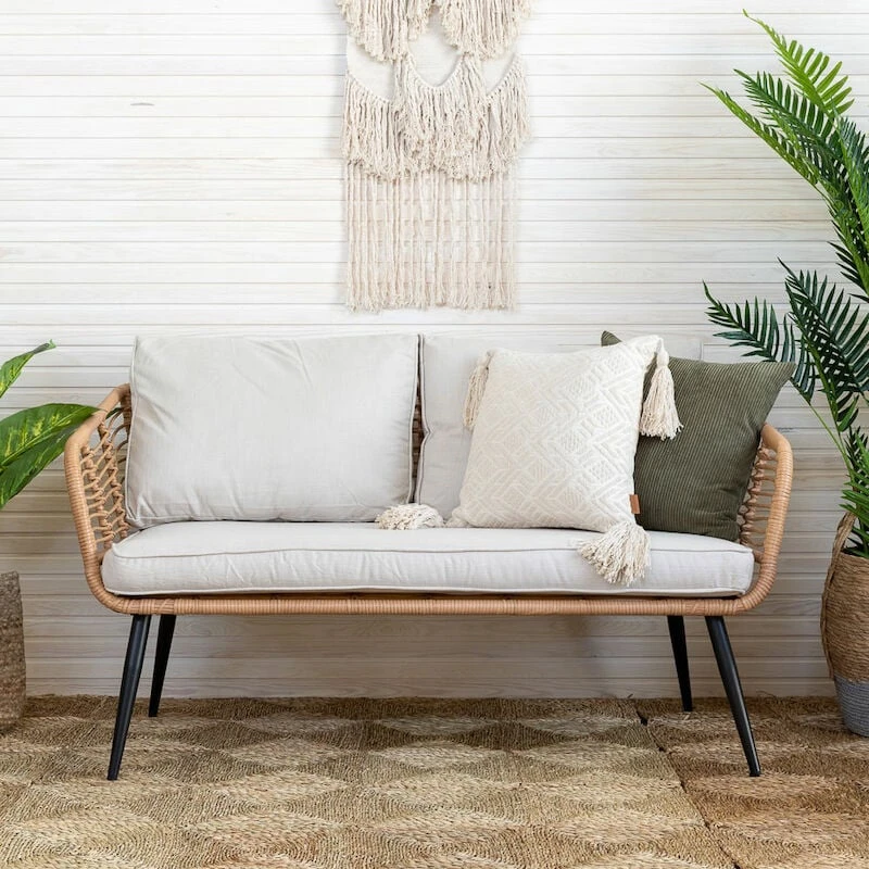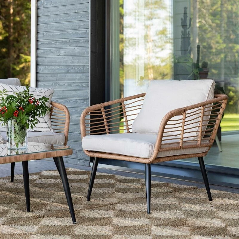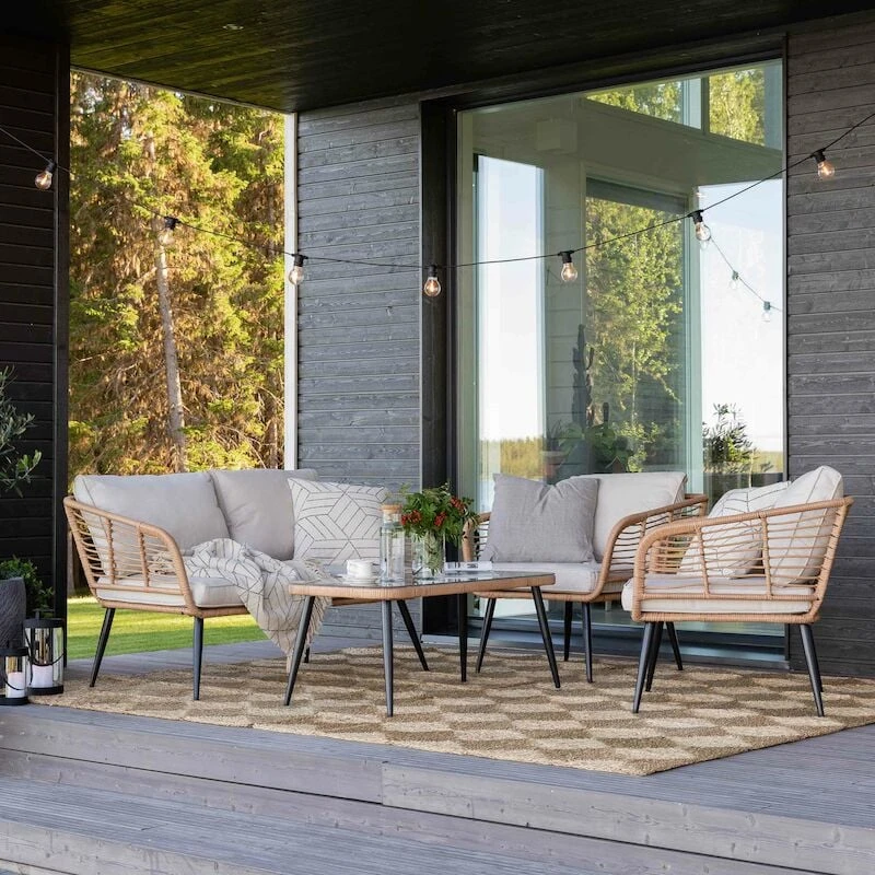 Kesäinen sohvaryhmä muhkeilla pehmusteilla koostuu sohvasta, kahdesta tuolista ja lasikantisesta pöydästä. Pehmusteet sisältyvät toimitukseen. Materiaali on UV-suojattua polyrottinkia ja runko mustaksi maalattua metallia. Pehmusteiden päällinen on 100% polyesteriä.