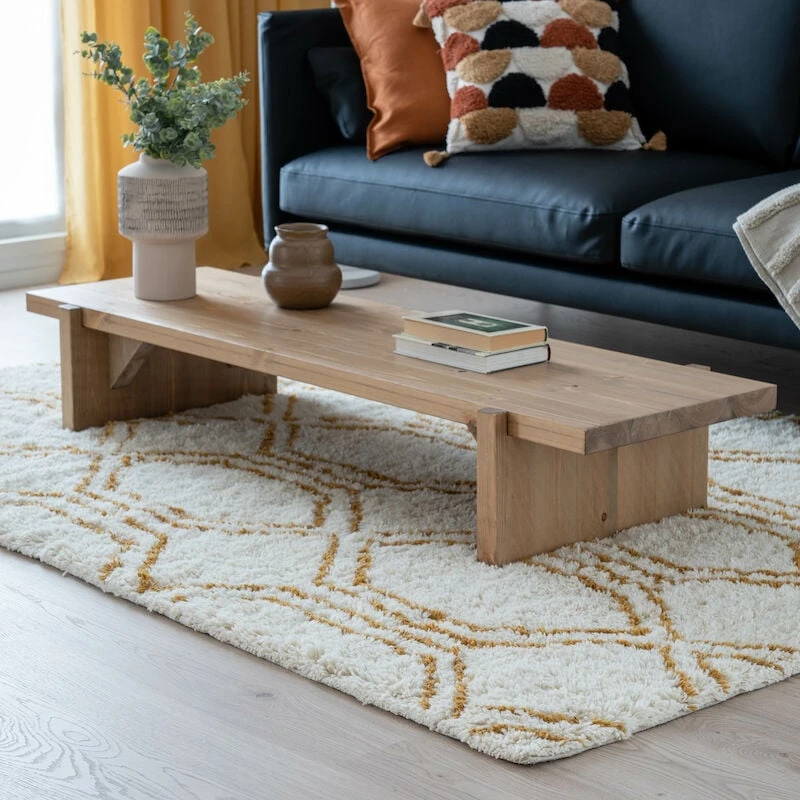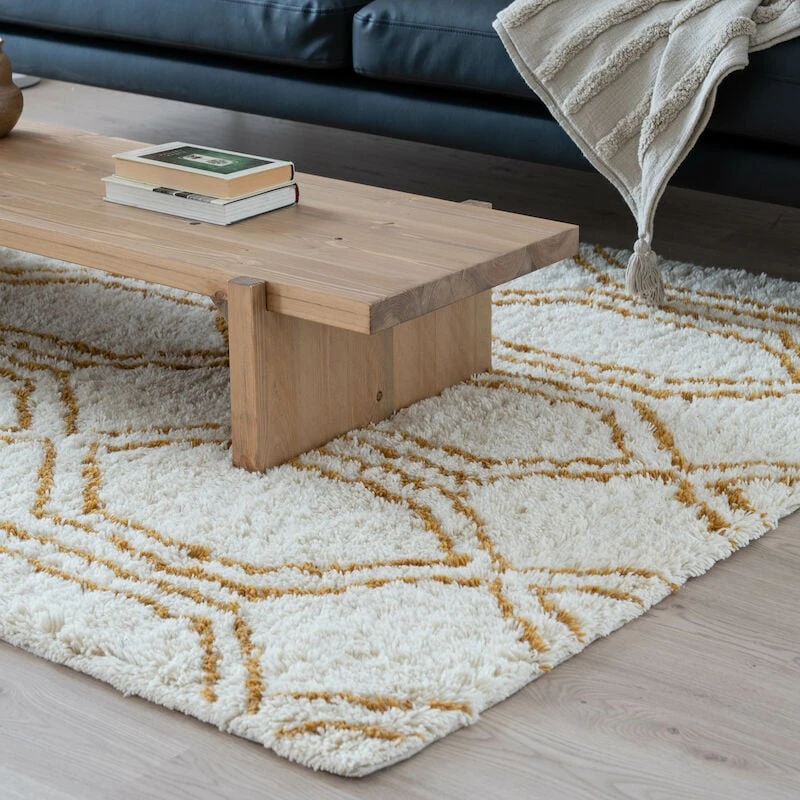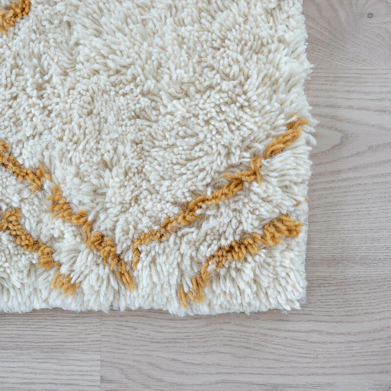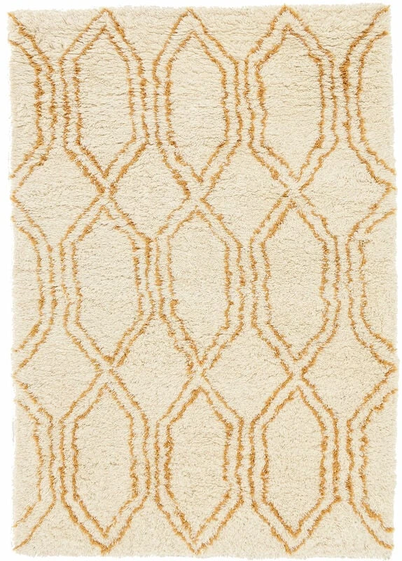 Paksu ja pehmeä käsinkudottu villamatto, jonka luonnonvalkoisella pohjalla kaunis okrankeltainen kuviointi. Matto on kudottu lyhyistä villakuiduista, jonka vuoksi matosta irtoaa aluksi nukkaa, mutta tämä vähenee kun matto tiivistyy käytössä.