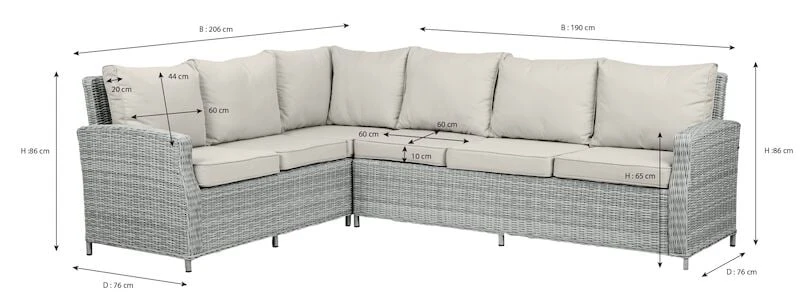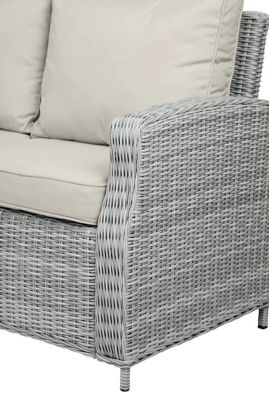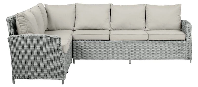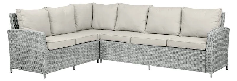 Tukeva ja tyylikäs Vila Vinga kulmasohva kestävällä alumiinirungolla. Sohva on punottu kauniilla ja helppohoitoisella, UV-suojatulla polyrottinkipunoksella. Kuvan muhkeat pehmusteet sisältyvät hintaan. Pehmusteiden päälliset on valmistettu vettähylkivästä polyester kankaasta, mutta ne eivät ole vedenpitäviä. Tuotetta suositellaan käytettäväksi ainoastaan katetussa ulkotilassa tai vaihtoehtoisesti ottamaan pehmusteet sisälle, kun eivät ole käytössä. Pehmusteiden päälliset ovat irroitettavissa ja pestävissä hellävaraisesti käsinpesulla miedolla saippualla. Kätisyyttä ei voi vaihtaa.