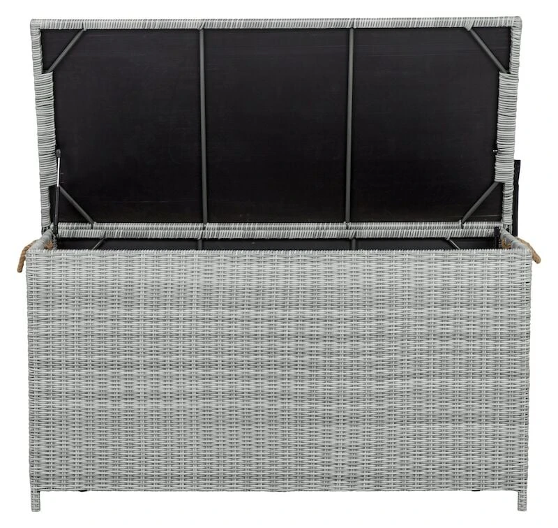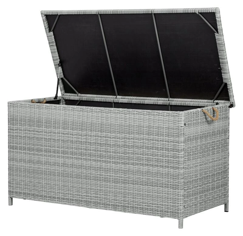 Tukeva ja todella tyylikäs Vila Vinga pehmustelaatikko. Runko alumiinia ja punos helppohoitoista, UV-suojattua polyrottinkia. Aukaistava kansi, jonka sisällä on reilusti säilytystilaa. Pehmustelaatikon päissä on sievät juuttinarusta valmistetut kantokahvat.